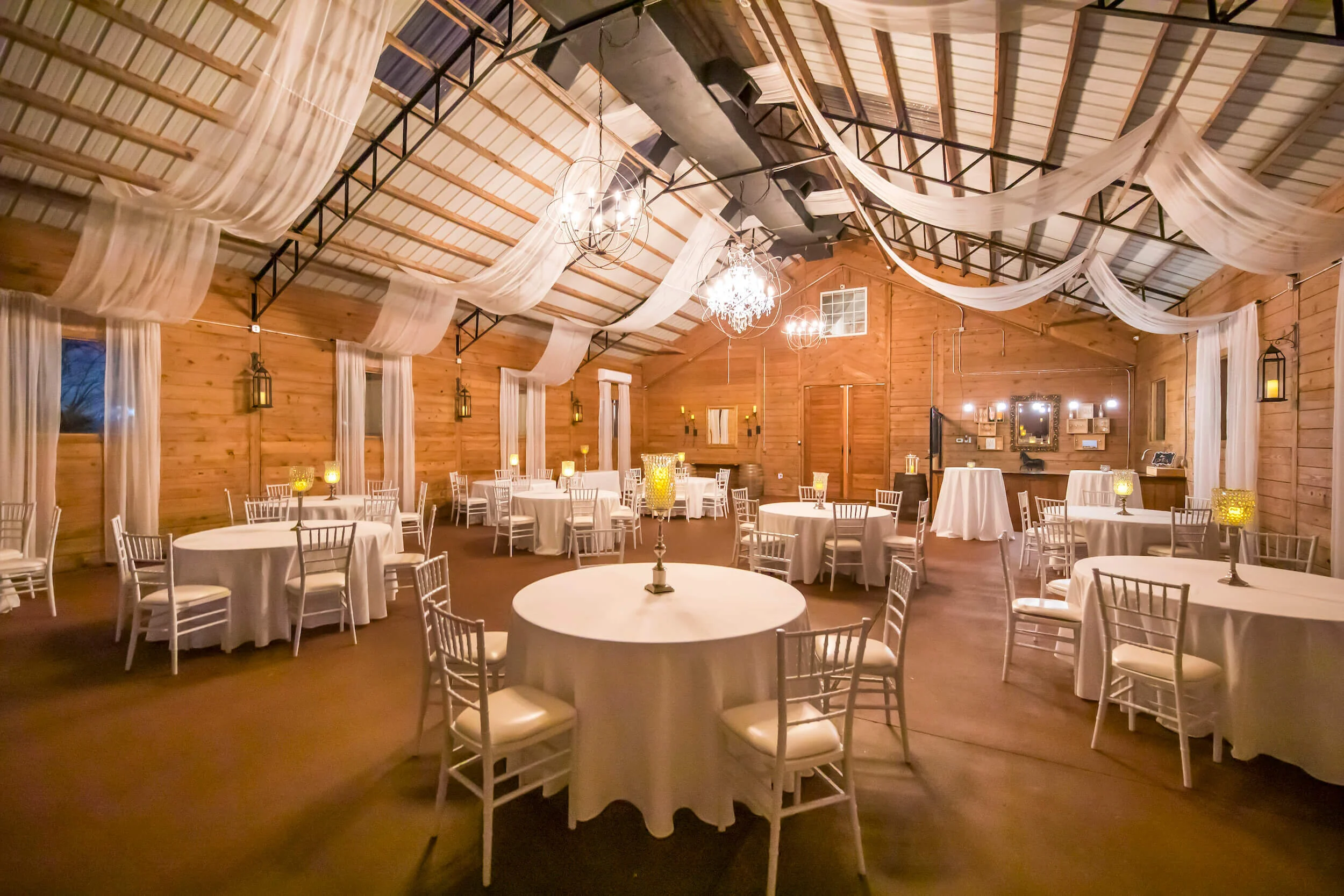 This flexible, open-concept space can easily be configured to accommodate a dance floor, elegant dining tables, meeting spaces, or even large-screen projections, making it ideal for a variety of events. The soaring ceilings, romantic draping, authentic equestrian décor, and picturesque setting create a truly unforgettable atmosphere.
